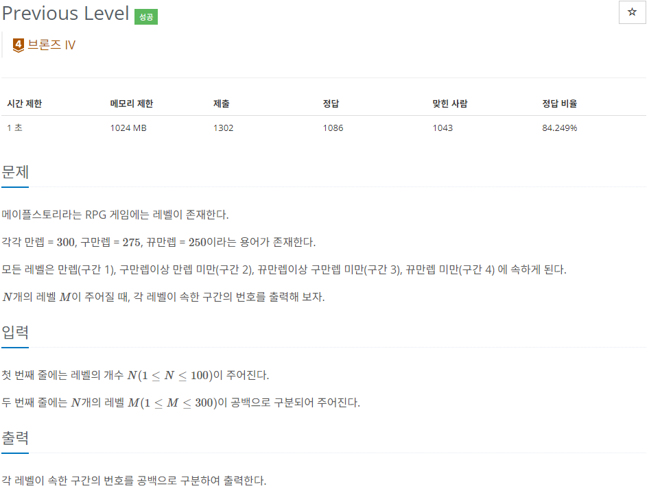 - 레벨이 300미만이고 275이상이면 2를 출력합니다.