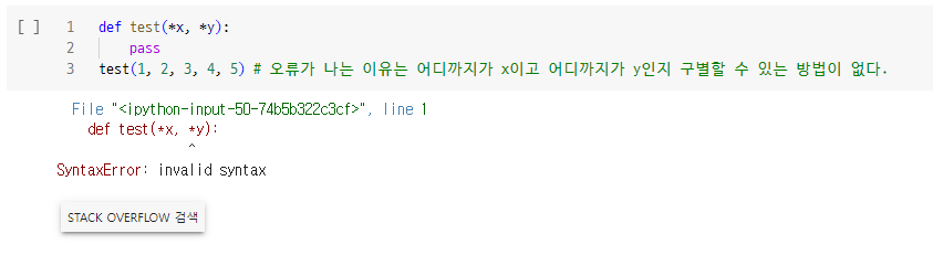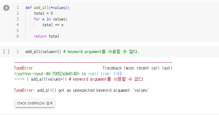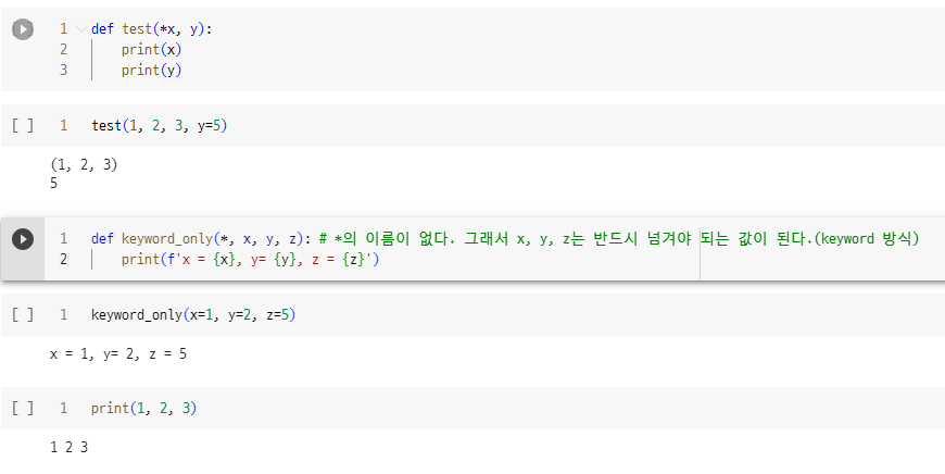 - 가변길이 인수는 `keyword` 방식으로 전달할 수 없습니다. `f(x=1, x=2, x=3)`