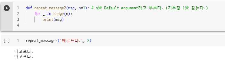- 함수를 정의할 때 파라미터의 설정된 기본 값을 `Default argument`라고 합니다.