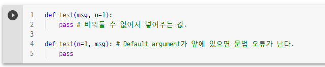- 함수를 정의할 때 `Default argument`를 갖는 파라미터들은 반드시 `Default argument`를 갖지 않는 파라미터들 뒤에 선언해야 합니다.