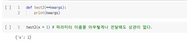 - 함수를 정의할 때 파라미터 이름 앞에 **를 붙입니다.