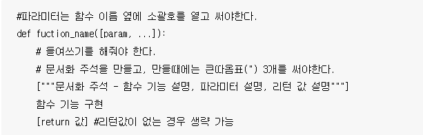 함수의 이름과 매개변수를 정의한 후에는 콜론(:)을 붙이고 들여쓰기로 함수의 내용을 작성합니다.