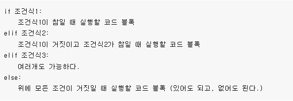 if문 다음에 여러 개의 elif(else if)문을 추가하고, 마지막으로 else문을 추가하는 방식 입니다.